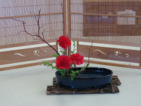 With all the excitement with Rocketman this week, I forgot to post on my second Ikebana (Japanese flower arranging) class. This week was working with twigs and how a few twigs, flowers and greens can create such a simple and beautiful arrangement. This one is the one I created with a lot of help from our instructor.